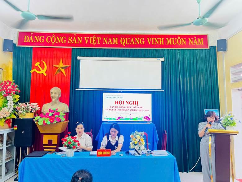 Hội nghị cán bộ công chức, viên chức và người lao động năm học 2025 – 2026 của trường THCS Lộc Hòa đã thành công tốt đẹp. Hội nghị đã thông qua Nghị quyết với các nội dung: công tác chính trị tư tưởng; công tác thi đua; sự phối hợp với thủ trưởng cơ quan đơn vị với các tổ chuyên môn, đồng thời kêu gọi toàn thể CBVCNLĐ phát huy những thành tích đã đạt được, phấn đấu thực hiện thắng lợi nhiệm vụ chính trị, tích cực đóng góp công sức và trí tuệ xây dựng Nhà trường ngày một vững mạnh.